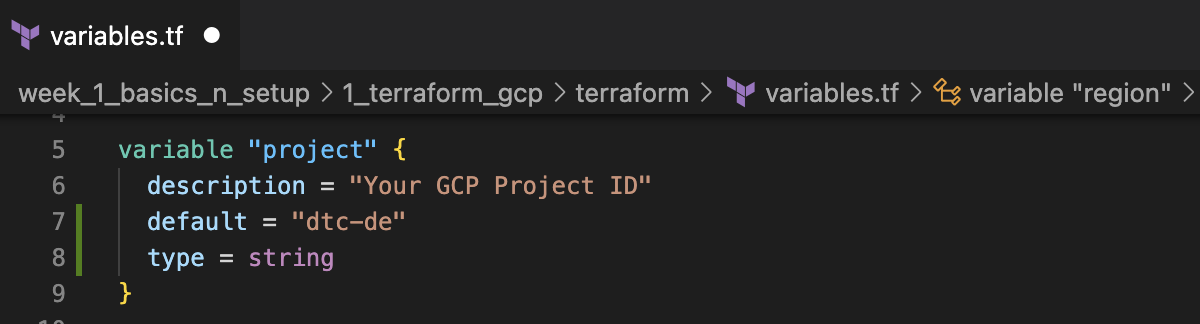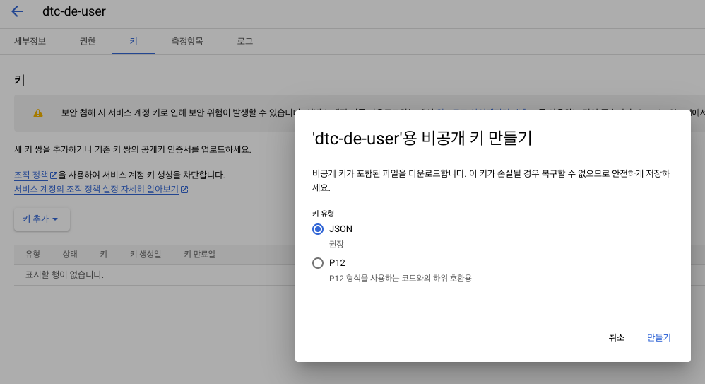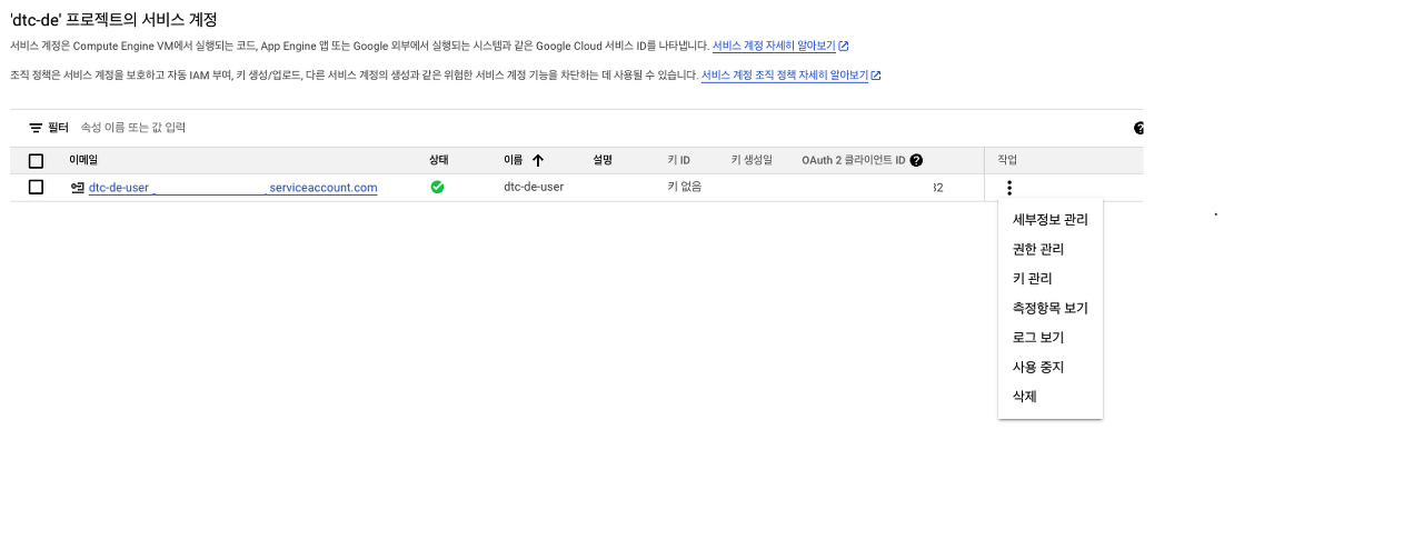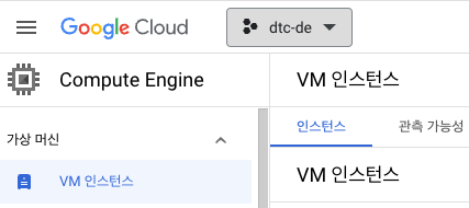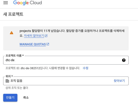 프로젝트 ID인 dtc-de를 입력하고 엔터를 누릅니다.