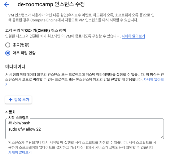 - vm 인스턴스를 종료한 뒤에 수정을 누르고 자동화 부분에 해당 코드를 입력하고 인스턴스를 다시 시작합니다.