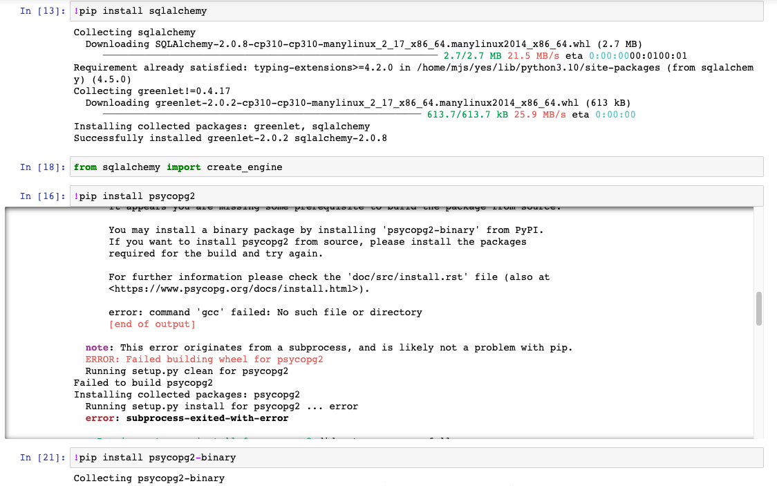 에러가 발생하여 해결하기 위해 psycopg-binary 라이브러리를 설치하고 다시 root로 로그인합니다.