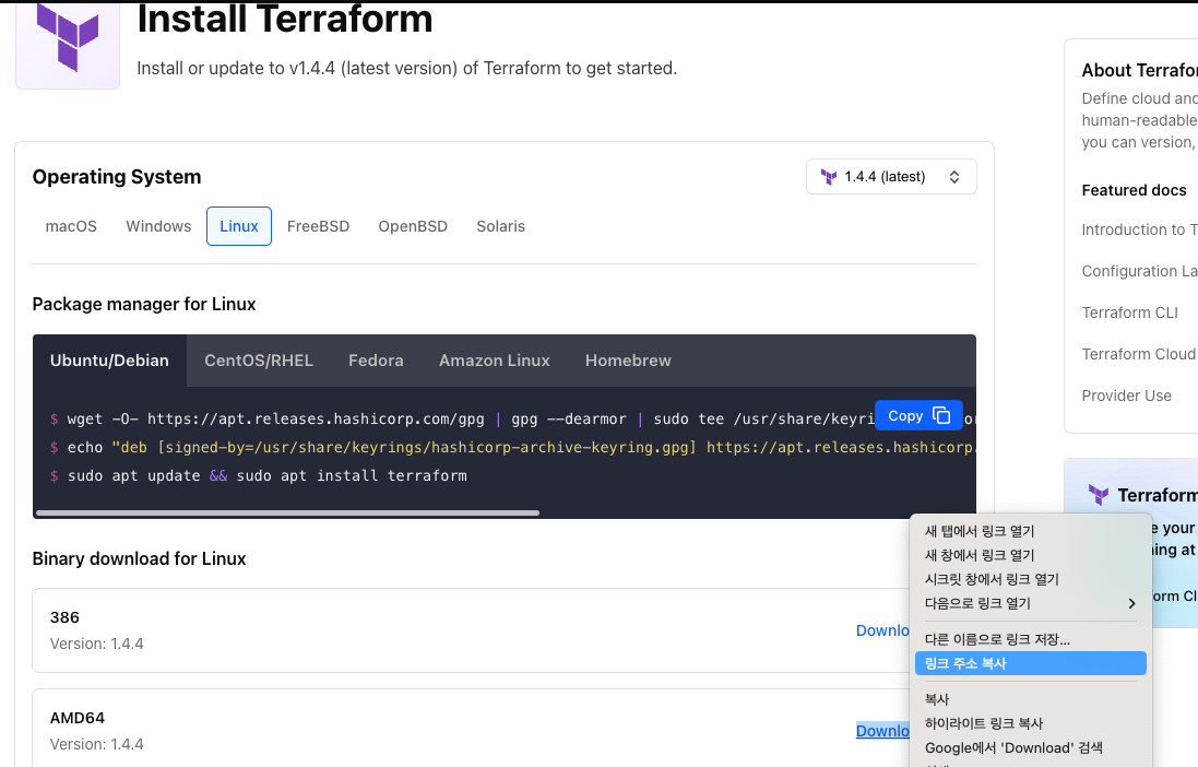테라폼 다운로드 홈페이지에서 링크 주소를 복사합니다.
