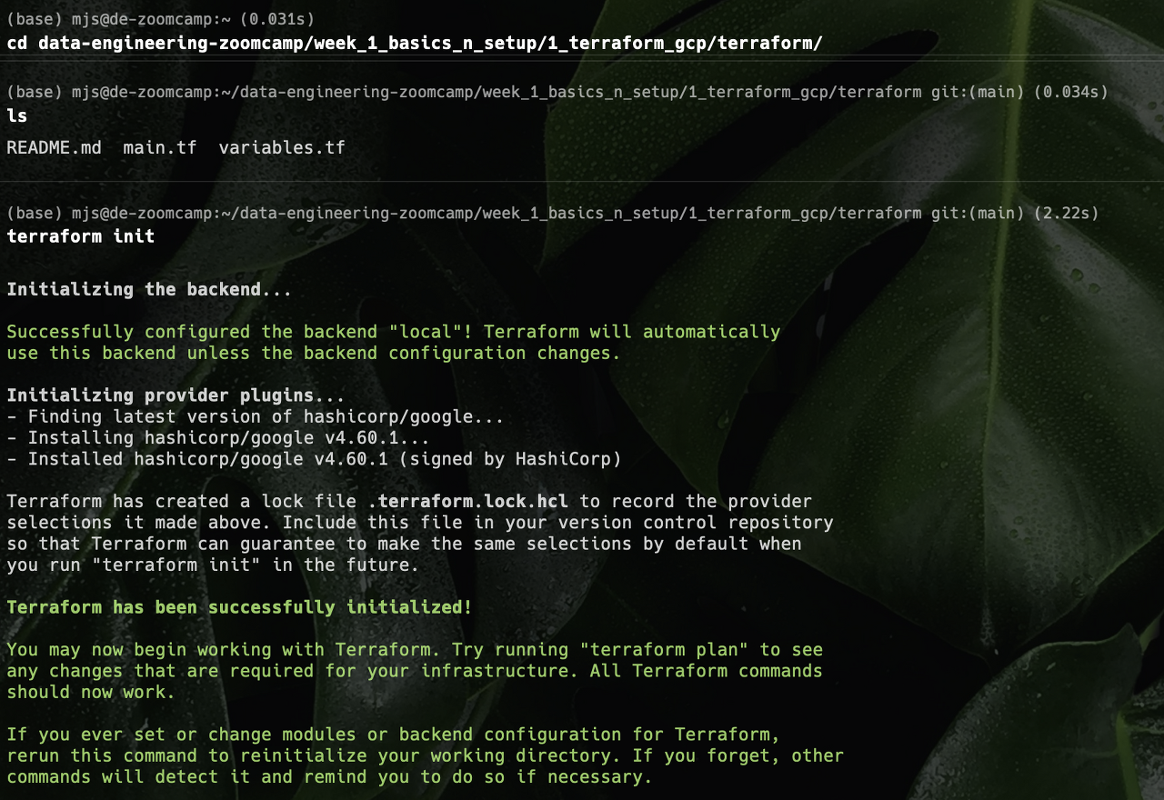 cd data-engineering-zoomcamp/week_1_basics_n_setup/1_terraform_gcp/terraform/ 에서 terraform init 명령어를 실행합니다.