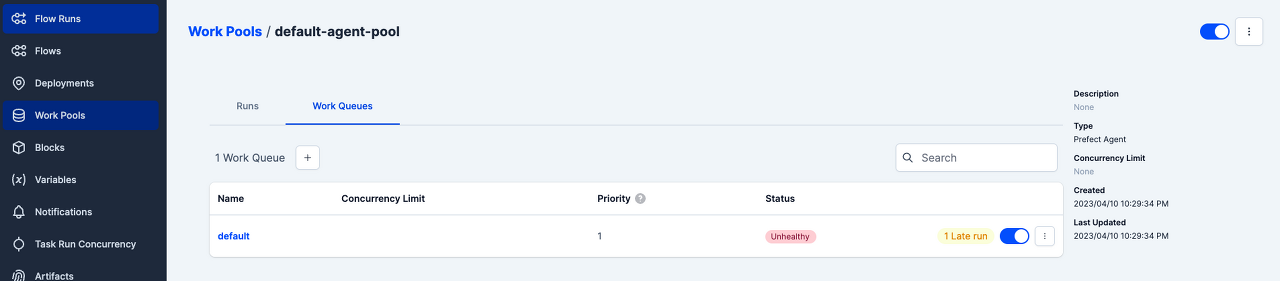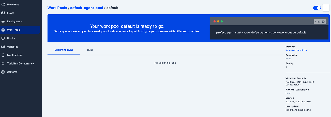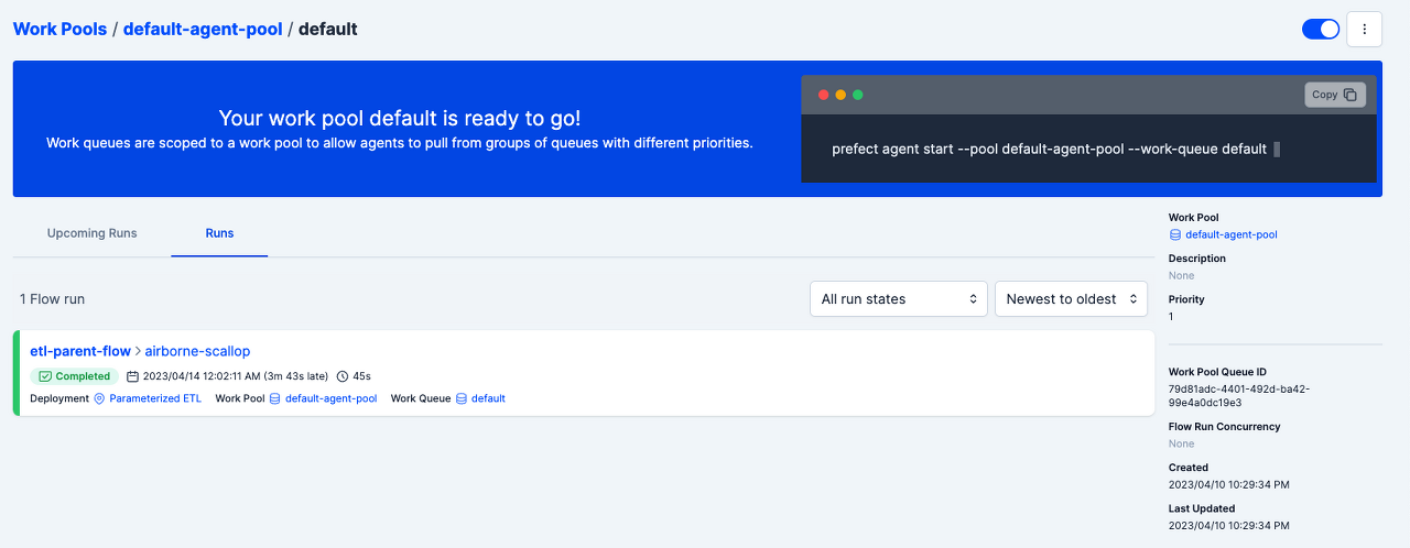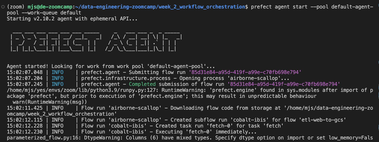 대기열에 저장되는데 실행 시키기 위해서 prefect agent start --pool default-agent-pool --work-queue default 명령어를 입력합니다.