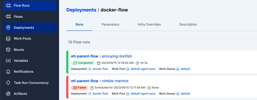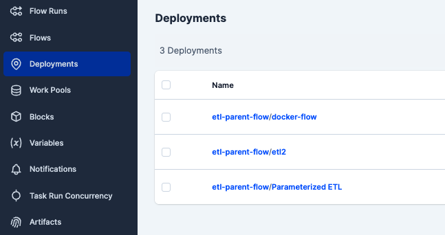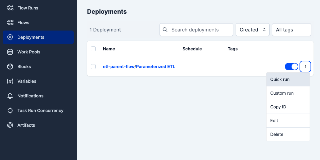 Prefect GUI로 이동하고 배포 섹션에서 방금 생성한 항목에 액세스합니다