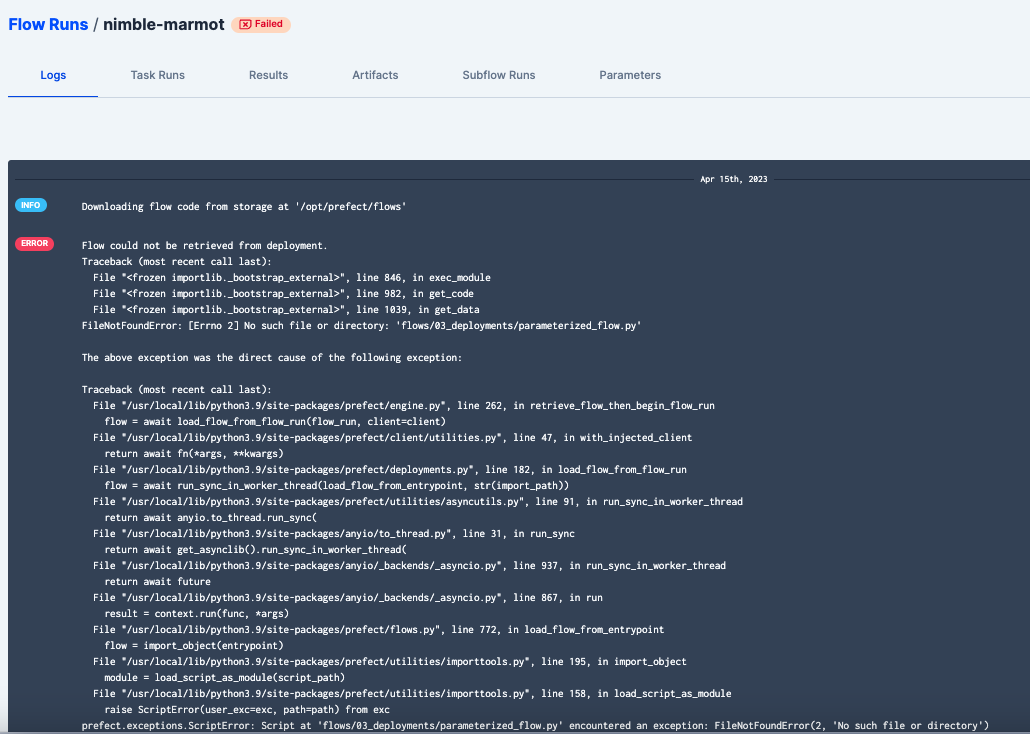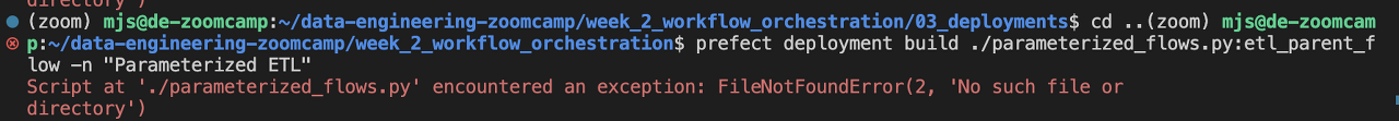 prefect에서 배포할 때 문제가 발생했습니다. prefect.exceptions.ScriptError: Script at 'flows/03_deployments/parameterized_flow.py' encountered an exception: FileNotFoundError(2, 'No such file or directory')