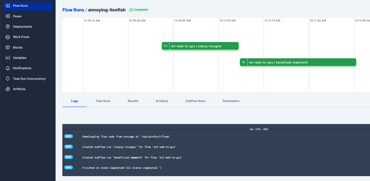 prefect Agent를 시작하면 Deployment 실행이 시작되는 것이 보입니다.