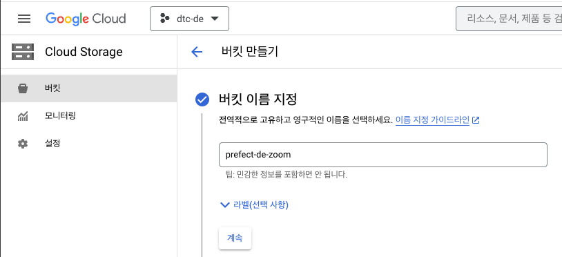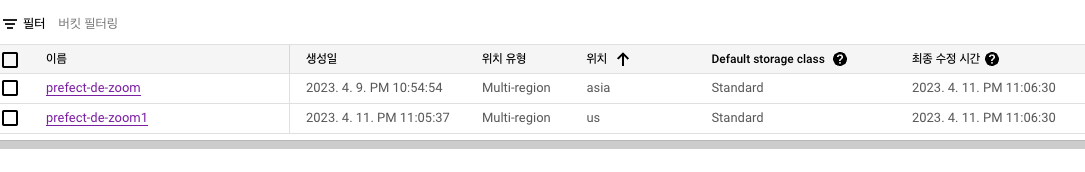버킷을 신규로 생성합니다. 버킷의 이름은 prefect-de-zoom으로 설정해줍니다.