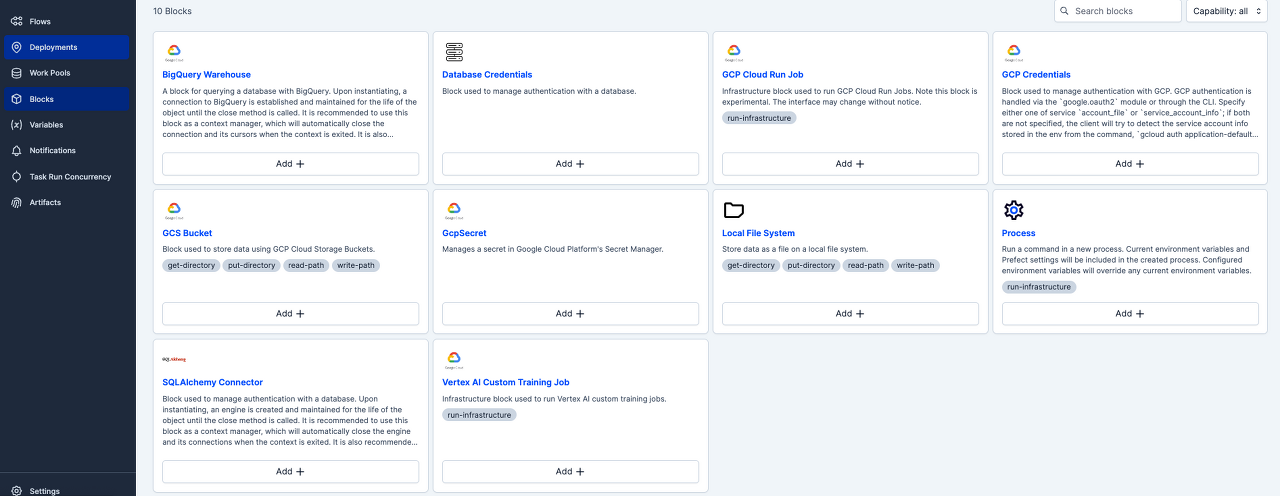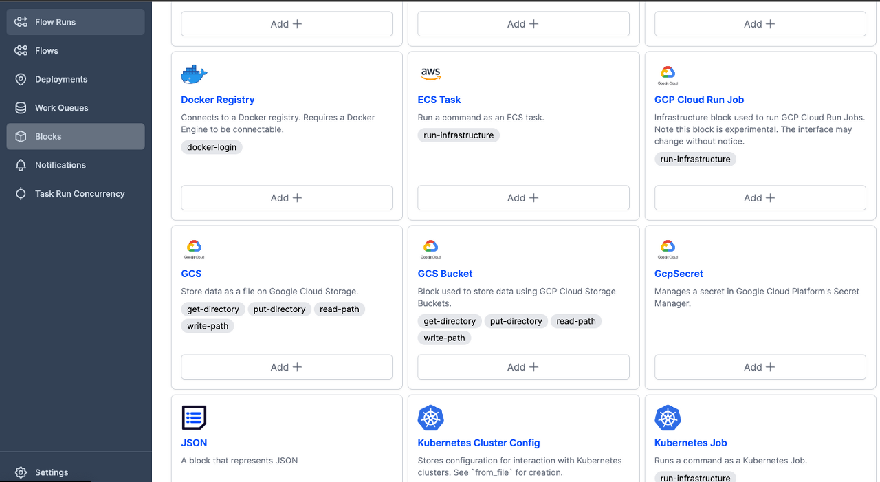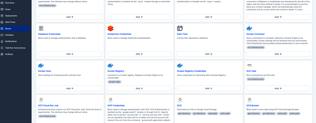 prefect 내부에서 Block를 눌러 다양한 커넥터를 확인합니다.