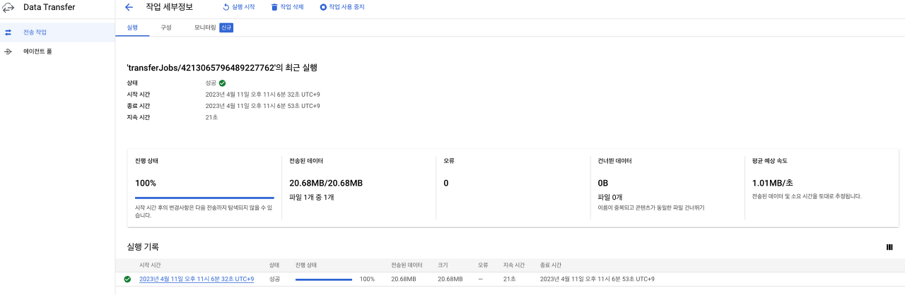- 신규로 US 리전의 GCS 버킷을 만들고 기존의 asia 리전에서 데이터를 전송합니다.