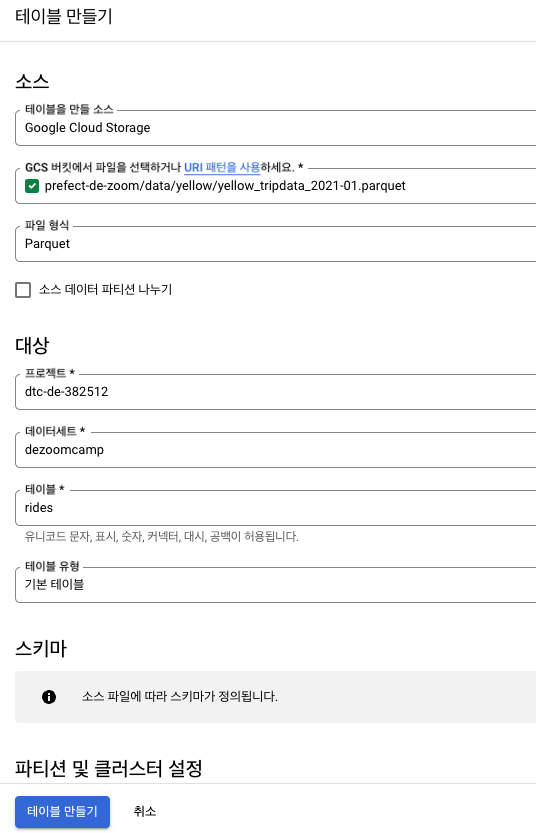 데이터를 GCP로 수집하려면 Parquet 파일의 스키마를 사용하여 BigQuery에서 테이블을 생성해야 합니다