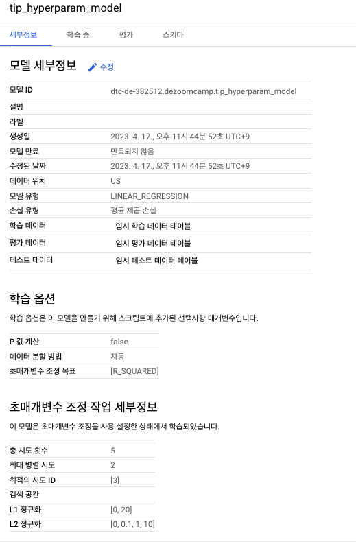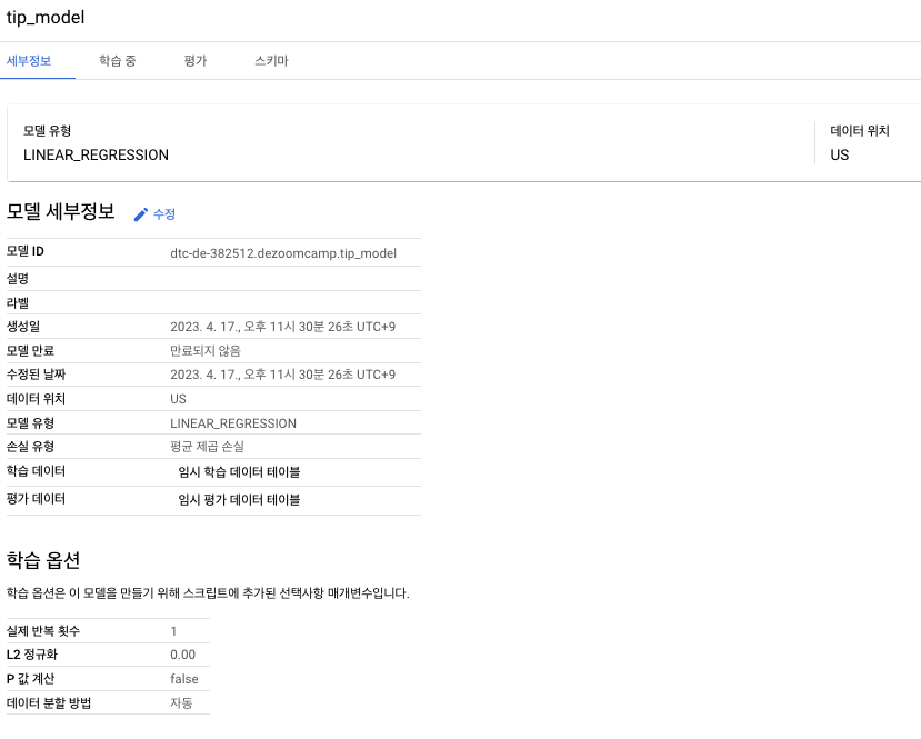 - MODELE_TYPE='linear_reg'에서는 선형 회귀 모델을 만듭니다.