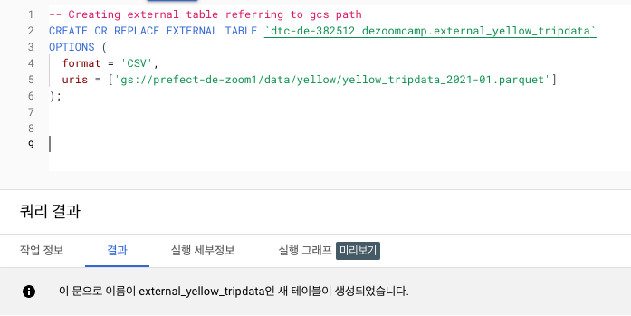 빅쿼리에서 외부 테이블을 생성해 줍니다.