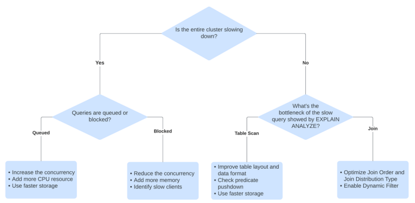- 자원이 부족하거나 자원 할당 및 최대 동시성 설정이 합리적이지 않을 수 있습니다. Trino는 많은 자원을 필요로 하는 컴퓨팅 엔진으로 자원이 부족한 경우 클러스터의 전반적인 처리량이 감소하는 것을 관찰할 수 있습니다.