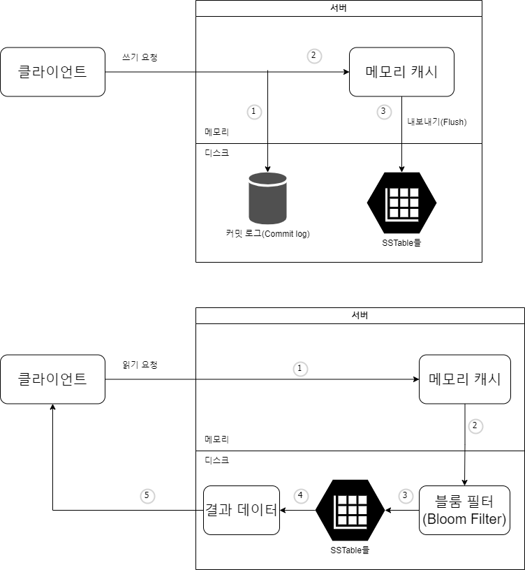 - 메모리 캐시가 가득차거나 사전에 정의된 어떤 임계치에 도달하면 데이터는 딧드크에 있는 SSTable에 기록됨. SSTable은 Sorted-String Table의 약어로 <키,값>의 순서쌍을 정렬히 리스트 형태로 관리하는 테이블