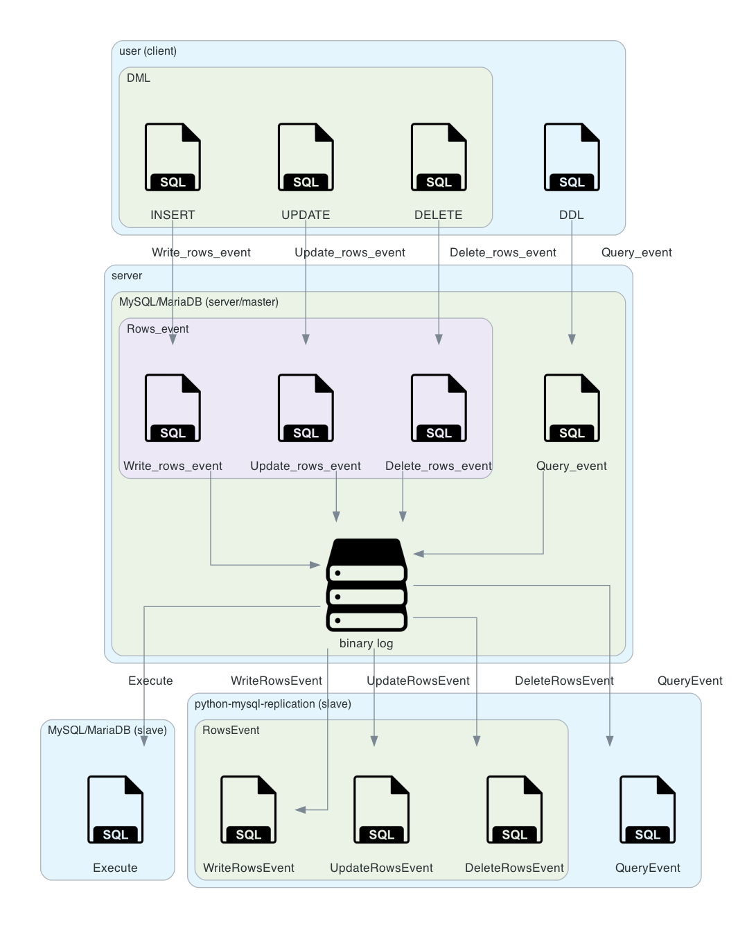 이진 로그 복제에 해당되며 MySQL 복제 프로토콜의 순수한 Python 구현입니다. 이것은 PyMYSQL 위에 구축되어 있으며, 이를 통해 데이터와 원시 SQL 쿼리를 가진 이벤트(예: 삽입, 업데이트, 삭제)를 수신할 수 있습니다.
