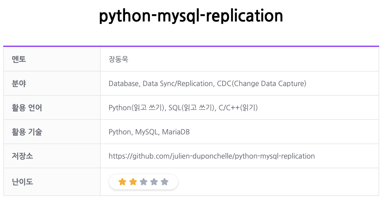 2023 오픈소스 컨트리뷰션 아카데미를 참가하면서 python-mysql-repllication프로젝트의 멘티로 참가하게 되었습니다. 약 3달간의 여정으로 온/오프라인 모임을 통해서 오픈소스 기여를 하였습니다. 참여 계기는 데이터 엔지니어링에 관심이 있는 다양한 분들과 협업을 하면서 개발 문화와 오픈소스에 기여하는 방식을 보고자 지원을 하였습니다. 또한 프로젝트 운영을 하면서 binlog 파일에 대해 이슈가 있었고 CDC에 관심이 있어서 세미나를 다니던 중 python-mysql-repllication의 분야가 핏이 맞아 신청을 하였습니다.