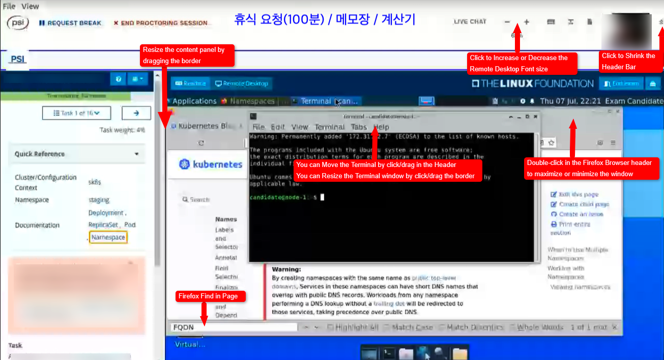 - 올해 초 CKA시험과 다르게 휴식 요청이 가능하며 자유롭게 사용이 가능한 거 같습니다. 저는 중간중간 머리가 안 돌아가거나 스트레칭을 하고 싶을 때 위에 휴식요청을 누르고 1분 정도 쉬고 다시 보았던 거 같습니다.(한 4번은 쉬었던 거 같습니다.)