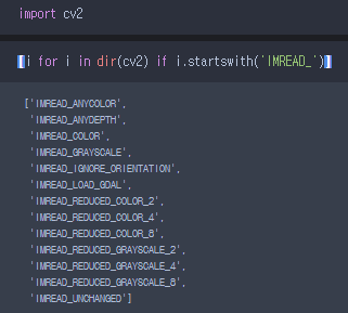 - 이렇게 명령문을 지정해 두면 cv2에서 IMREAD로 시작하는 것을 전부 볼수있다.