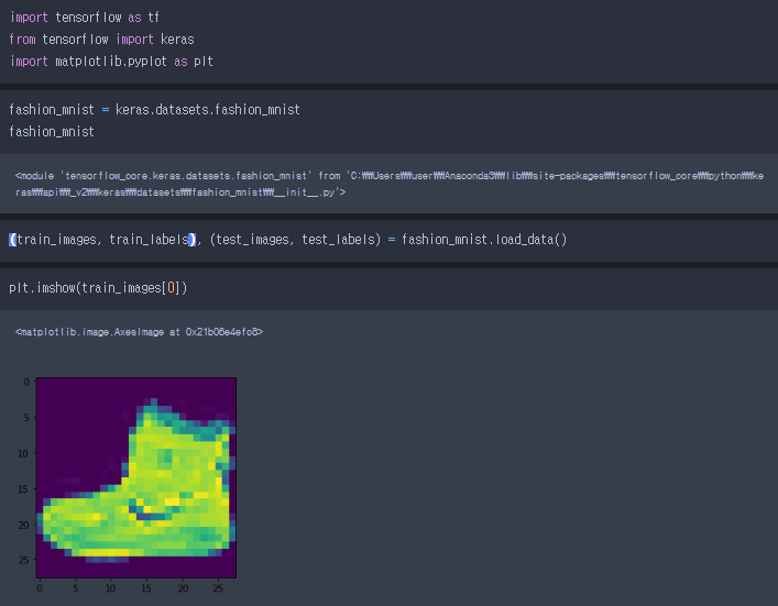 - tensorflow keras에 있는 datasets에서 fashion_mnist 파일을 불러들어와서 image와 lable로 트레이닝 테스트 스플릿을 하고 이미지 데이터를 보기 위해서 matploblib에 있는 imshow를 사용하였다.
