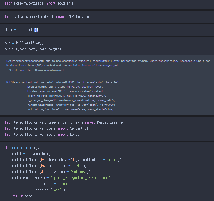 - datasets에서 iris데이터를 불러오고 뉴럴네트워크에서 MLPClassfiier를 불러들어와 fit시켜보았다.
