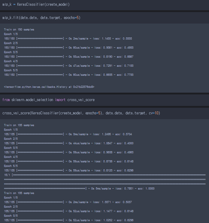- KerasClassifier에 에폭을 5로해서 학습을 시키고 교차검증을 해보았다.