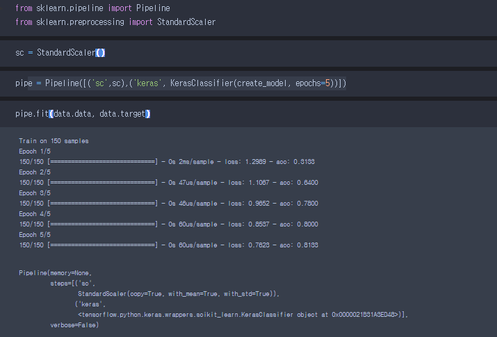- tensorflow에 keras에서 KerasClassifier를 불러들어와서 Sequetial을 이용해 모델을 만들어봤다.